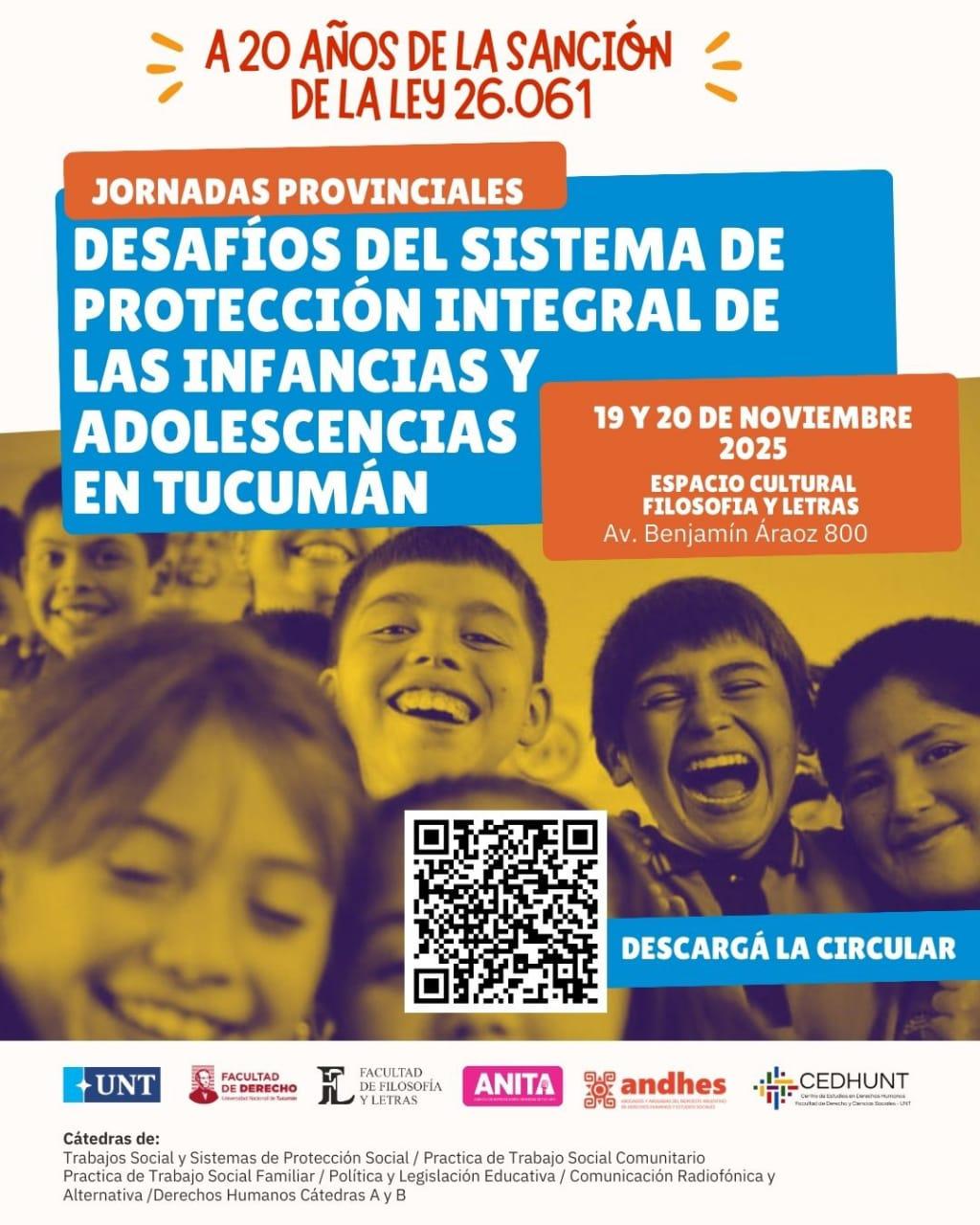 Los días 19 y 20 de noviembre de 2025, en la Facultad de Filosofía y Letras de la Universidad Nacional de Tucumán, se realizarán las Jornadas Provinciales de debate y reflexión: “Desafíos del Sistema de Protección Integral de las Infancias y Adolescencias en Tucumán a 20 años de la sanción de la Ley 26.061”.