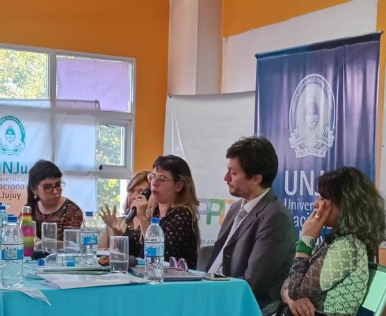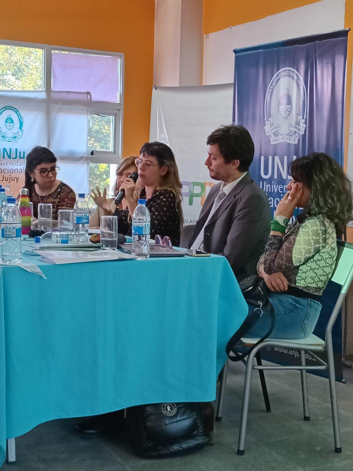 Las ponencias recuperaron problemáticas que desde nuestra organización venimos acompañando e investigando: la criminalización de la protesta y la violencia institucional en contextos de defensa de derechos y territorial; las dificultades de acceso a la justicia de mujeres y personas LGBTI+ privadas de libertad; y las consecuencias de un modelo productivo extractivista. En este sentido se presentó un análisis sobre la criminalización de la protesta y la situación de las personas defensoras de derechos humanos a dos años de la reforma constitucional de 2023. Se recordó que “Jujuy sigue siendo un territorio hostil para quienes defienden derechos”, donde el poder judicial, lejos de garantizar derechos, opera muchas veces como una herramienta de disciplinamiento político y social. Se señaló que esta hostilidad tiene consecuencias no solamente legales sino profundamente simbólicas, y que el Estado provincial ha utilizado el derecho de manera selectiva para castigar la protesta, mientras desatiende las denuncias por violencia institucional; materializandose hoy en que la figura de las y los defensores de derechos humanos enfrenta un escenario de persecución y desgaste, donde la judicialización de la protesta busca inhibir la participación social y quebrar los lazos comunitarios que sostienen las luchas territoriales.